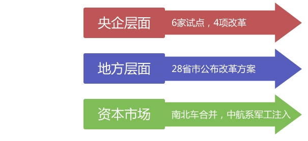 2015年国企改革已从中央、地方到资本市场各个层面全面铺开,央企层面, “四项改革”试点6家集团;地方国企层面,已有28个省市公布了省级国企改革方案;资本市场上,南北车合并,中航系军工资产注入,宣告国企改革大幕已在资本市场徐徐拉开。