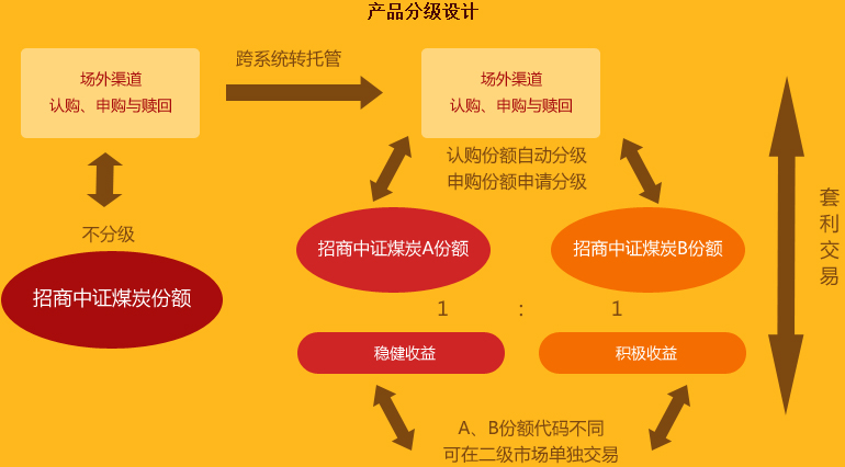 本基金通过场内、场外两种方式公开发售。其中,场外指通过基金管理人的直销中心和代销机构公开发售;场内指通过具有基金代销资格的深圳证券交易所会员单位公开发售。投资人可在场内或场外赎回招商中证煤炭份额,可在二级市场交易招商中证煤炭A份额和招商中证煤炭B份额。招商中证煤炭A份额和招商中证煤炭B份额上市交易后,由于受市场供求关系的影响,基金份额的交易价格与基金份额净值可能发生偏离而出现折/溢价交易风险。