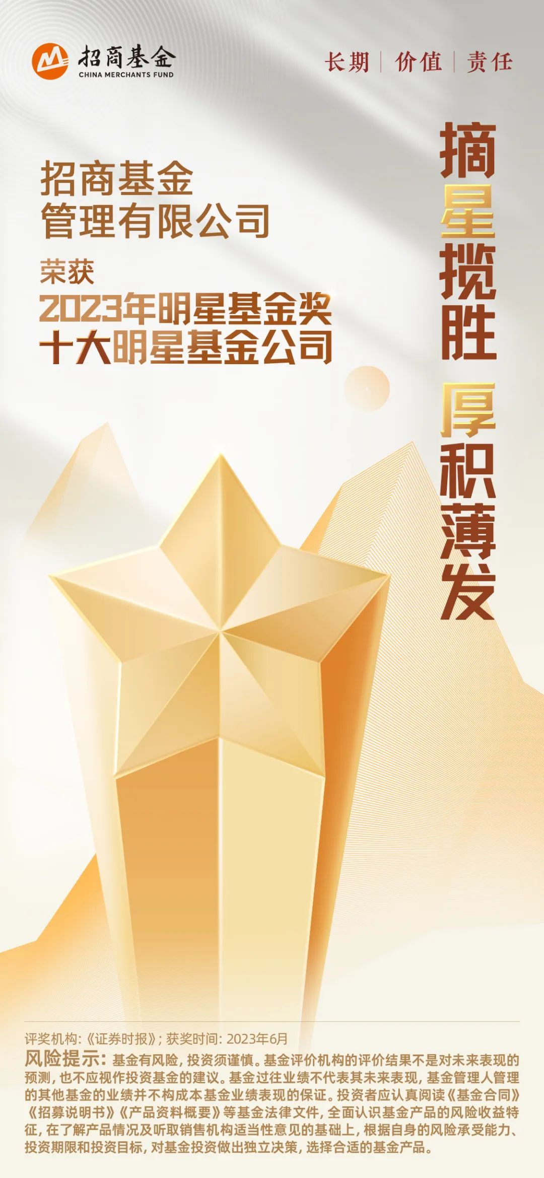 6月7日,2023年中国基金业明星基金奖获奖榜单重磅发布,招商基金摘“星”揽胜,共荣获四项大奖,是此次获得明星基金奖数量最多的基金公司之一。公司奖项方面,招商基金一举斩获“十大明星基金公司”大奖,权益投资团队荣获“三年股票投资明星基金公司”;产品奖项方面,招商基金旗下招商产业债券基金获得“七年持续回报积极债券型明星基金奖”,招商双债增强债券(LOF)获得“五年持续回报积极债券型明星基金奖”。