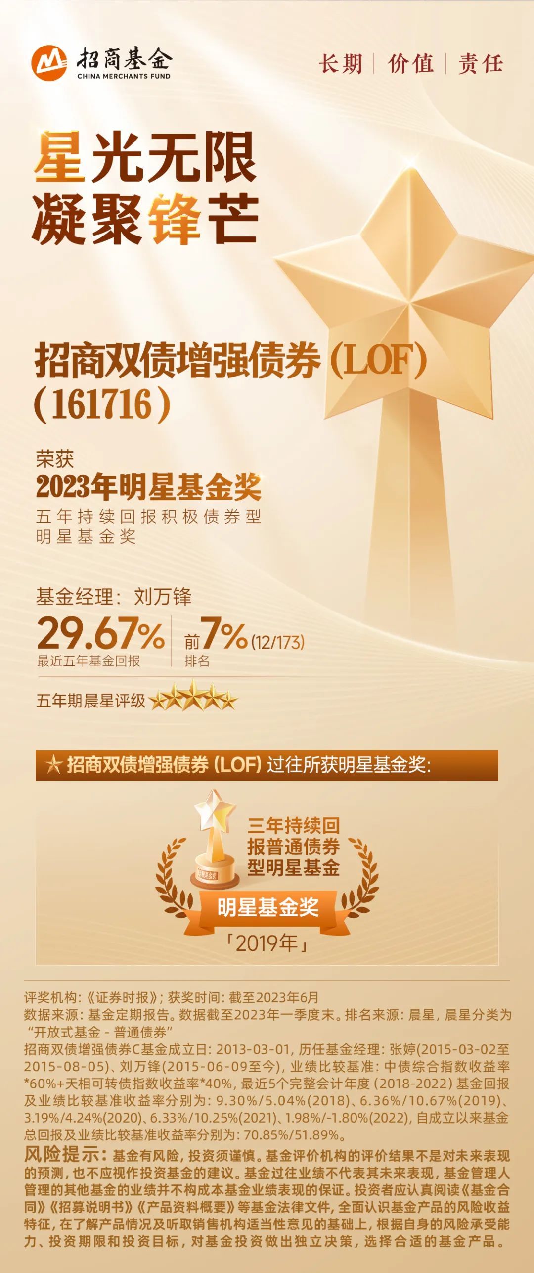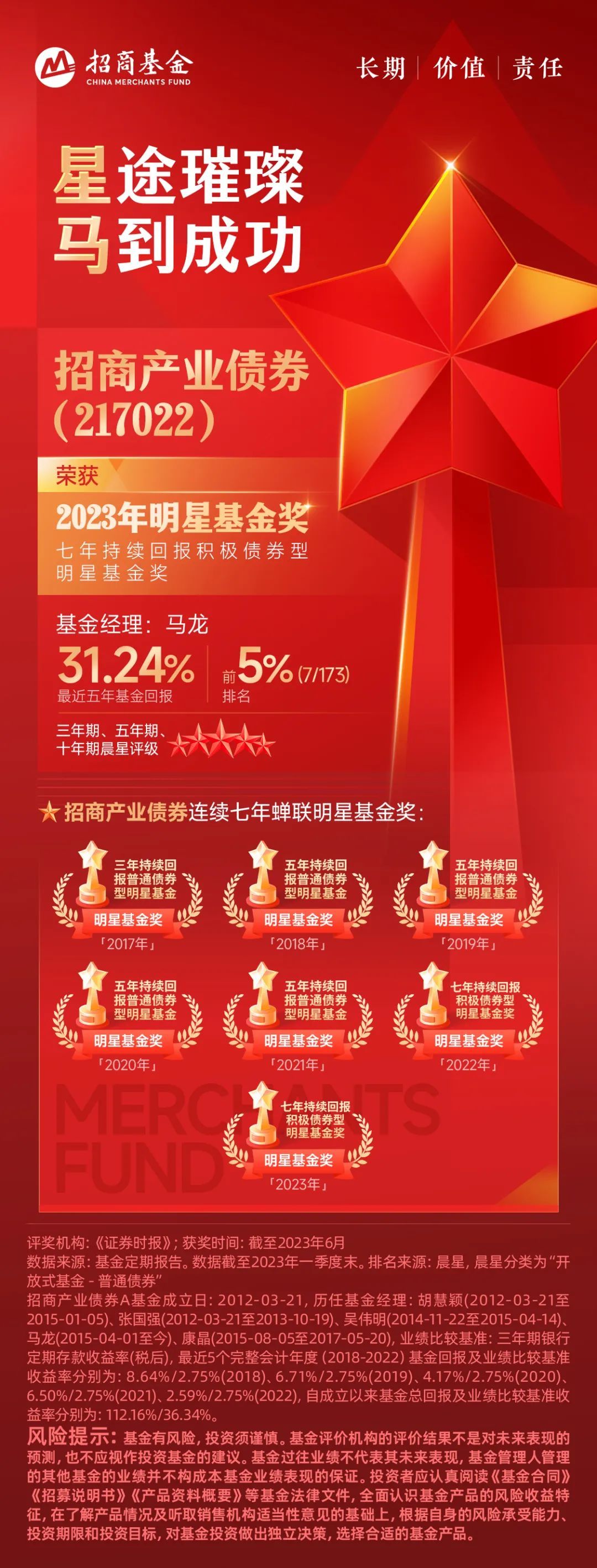 此次摘得“七年持续回报积极债券型明星基金奖”的招商产业债券基金,已连续七年蝉联该奖项。自2012年成立以来累计回报达112.16%,超额收益为75.82%,基金经理马龙自2015年开始管理,近七年、近十年回报率均在同类基金中排名第2。奖项方面,除七度获得明星基金奖外,招商产业债券也屡获权威评奖,被誉为“固收大满贯”基金。截至2023年6月,招商产业债券已连续七年蝉联金牛奖,连续六年蝉联金基金奖,并在2023年再度荣获全市场同类唯一的晨星基金奖。